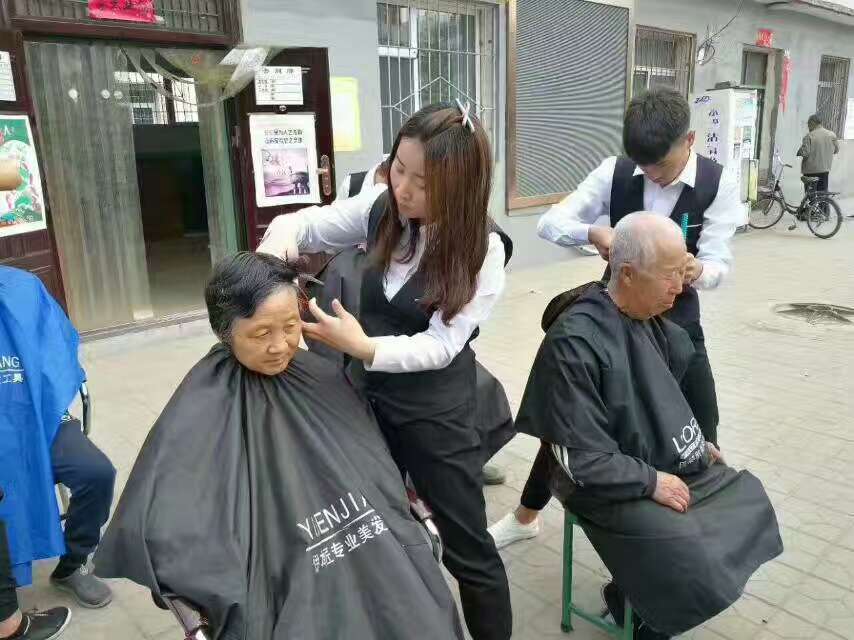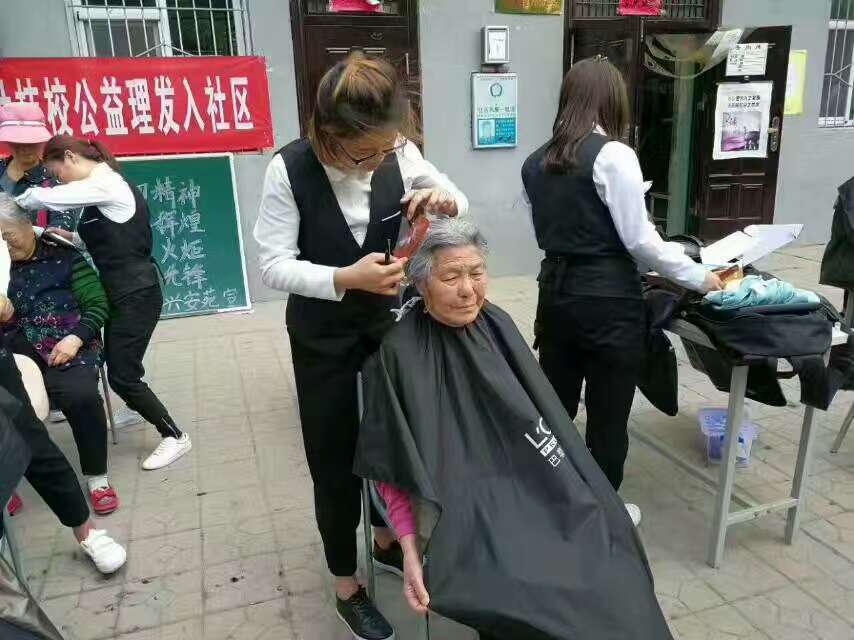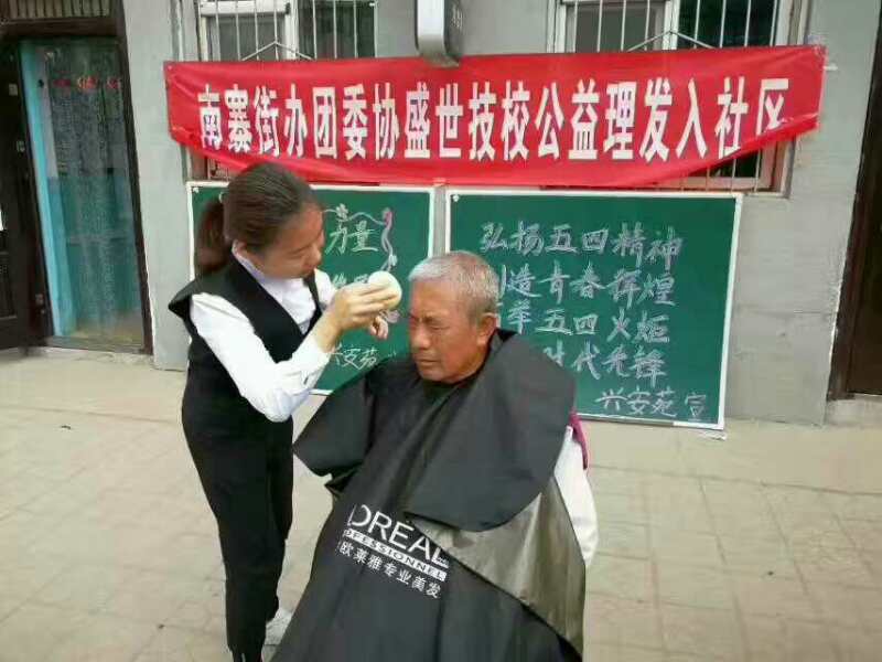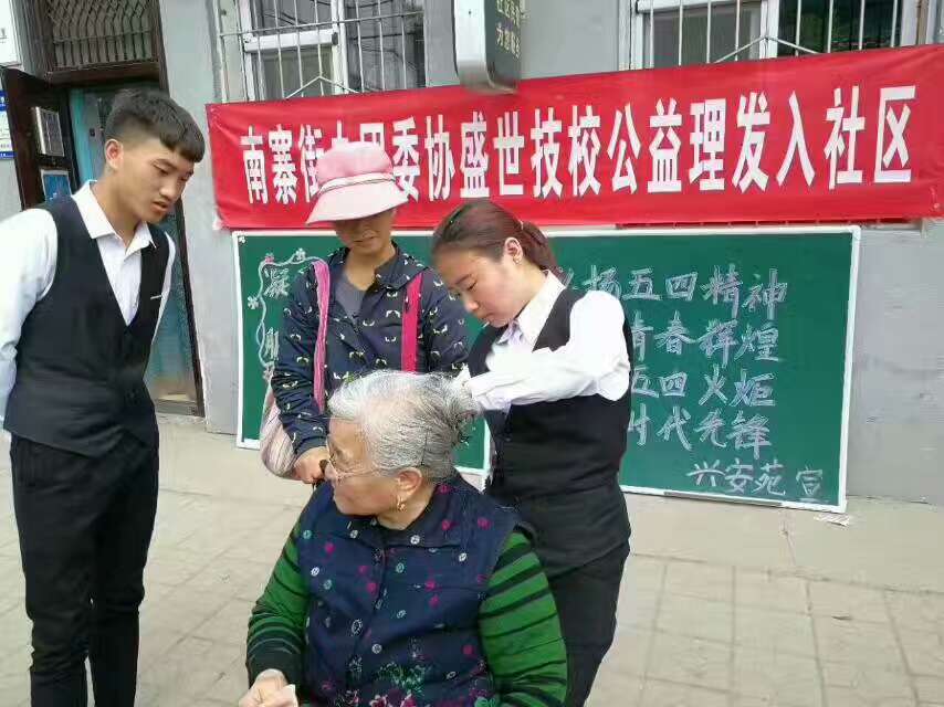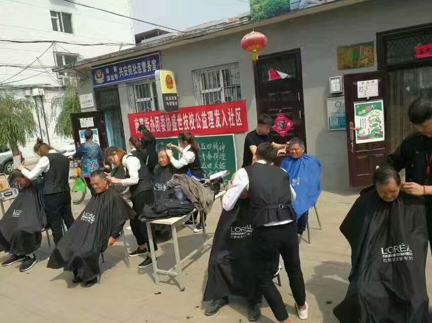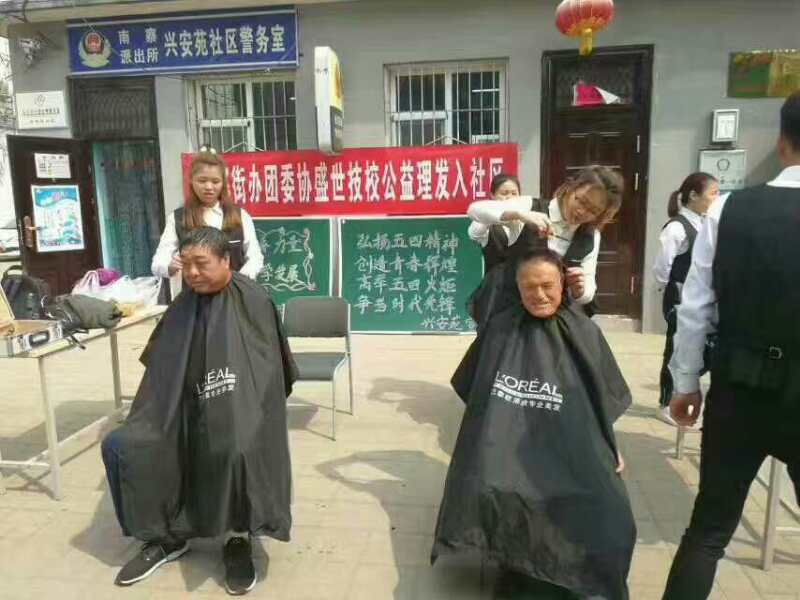 5月2日,正值“五四青年节”来临之际,山西盛世餐饮旅游技工学校美发班的学生在老师的带领下,利用休息时间,来到了南寨街道办做义工为老人理发.