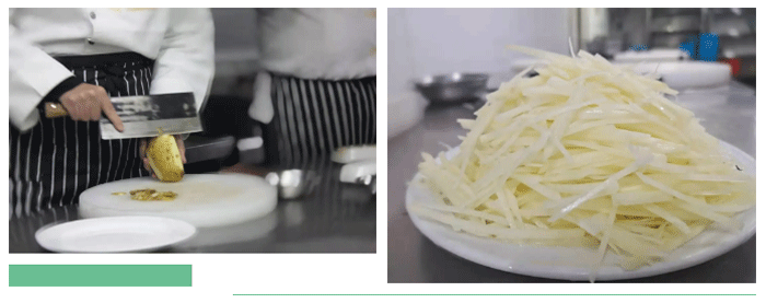 一个470g的土豆在7分钟内完成去皮之后切丝,净重达到400g以上为合格、410g以上为******,“丝”的粗细不仅要达到2.5-3mm,还要匀称,同时还考核卫生、仪容等内容。